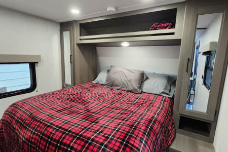 The main bedroom area has lots of privacy and room to get around the bed for access on both sides. We will provide all bedding and blankets, even a few extra if it gets cold on those camping mountain nights.