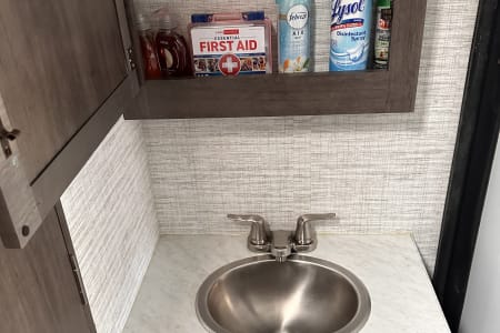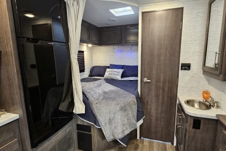 Designed for both relaxation and convenience, it offers a comfortable queen-size bed, king size loft, spacious bathroom with a shower, and high-end finishes throughout. Not to mention the exterior features; power awning with nighttime led lighting, external LP connections for grills, hot and cold showers for when the kids have had too much fun outdoors.