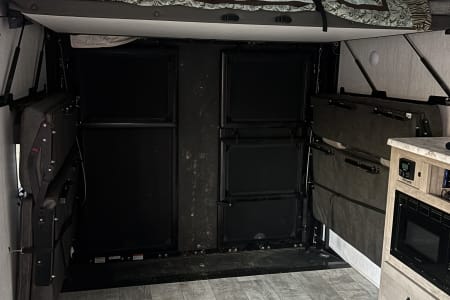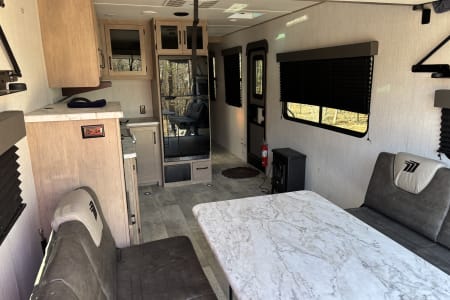 This is a spacious Grand Design MAV 27! Perfect for a weekend get away with the kid riding dirt bikes and four wheelers or even just relaxing on a porch with the back door elevated. You can comfortably sleep 4 people but if you wanted you can squeeze 6-8 with the air mattress provided in the door. You can also haul 1 four wheeler or 3 dirt bikes properly tied down. When the day is done you have an outside shower that you can hose down yourself and your bike before loading. This unit has a 100 gallon fresh water tank if you are dry camping with an instant hot water heater.