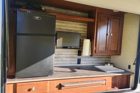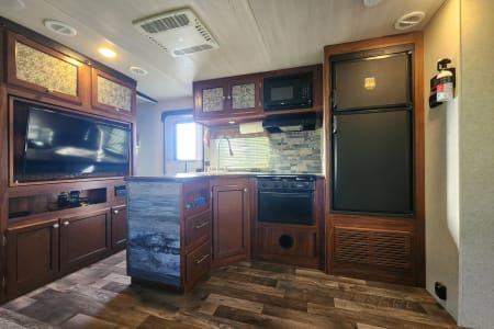 Fully Stocked Kitchen: Cook delicious meals on the go with a large fridge, stove, oven, microwave, and ample counter space.