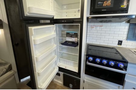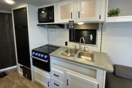 -Stove, microwave, refrigerator, and plenty of storage for all your cooking needs.