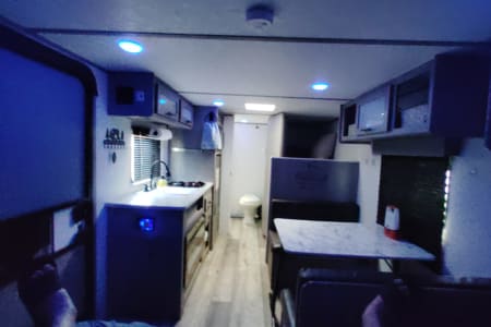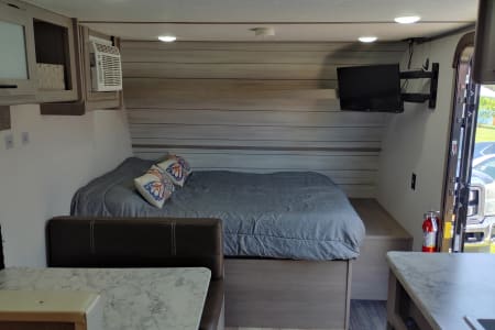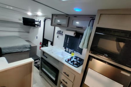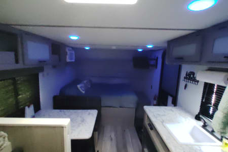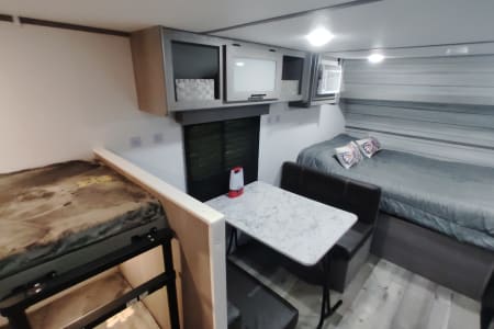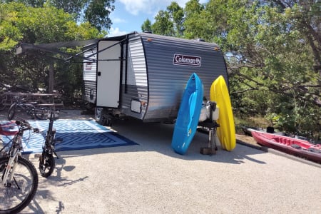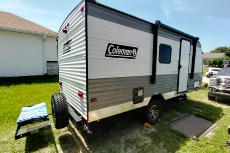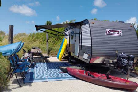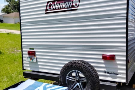 Hello this is our 2024 Coleman 17B. We enjoy making memories exploring different places with. It's an easy to tow camper, easy to back up, park and set up. We have done a lot of upgrades to it including adding a new eco friendly gas generator that's very quiet and sips around two gallons of gas in 10 hours for off grid adventures. Also aftermarket wheels and all terrain tires with matching spare. Diamond plate lower siding for added protection and a upgraded look. We added a new extra step to account for the height. Also added a rear cargo rack to take our electric bikes and mountain bikes. It will fit four bikes or anything else. We added an electric jack in the front to make it easy hooking up. There's also a tow stabilizer. On the inside it has two twin bunks in the rear and a camper queen in the front. Also the dinette table turns into a bed with room for two small children. There's an electric fireplace that changes into very nice colors. Microwave, mini fridge and gas cooktop. We added a smart TV on a nice swivel that swings outside the door for outside entertainment. It also has an outdoor mat with two nice outdoor chairs with sun visors. We also have a stainless tabletop grill for outdoor grilling. We also have two adult kayaks and two children kayaks available. We aim for renters to enjoy our camper and make great memories with friends and families like we have.