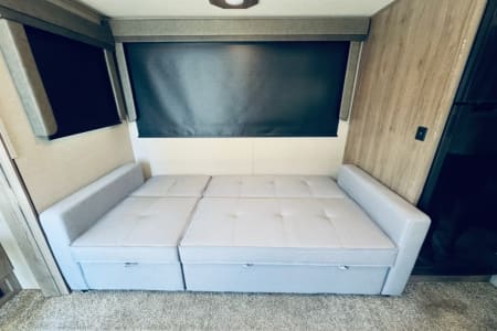 This bright and sunny trailer not only has a lot of windows for viewing, but a great floor plan including a private Queen bed master, with under and over the bed storage and a sliding barn door to close off the main bedroom. Additional sleeping areas includes a queen bed/sofa conversion.