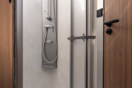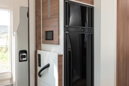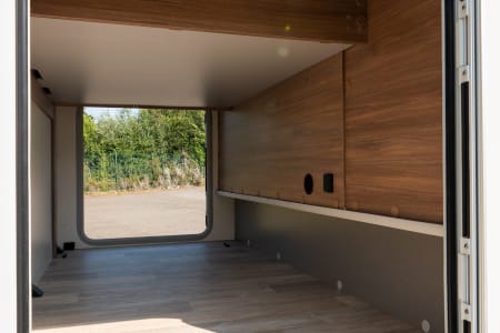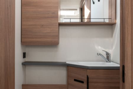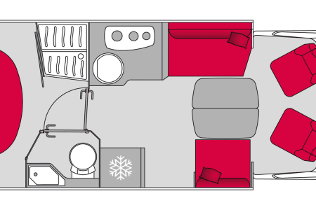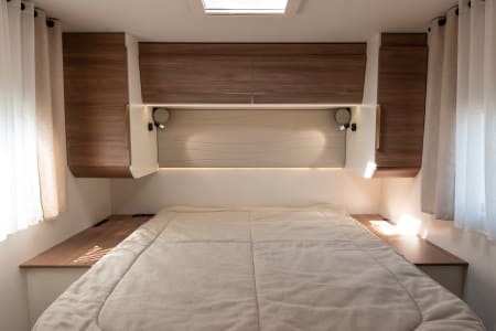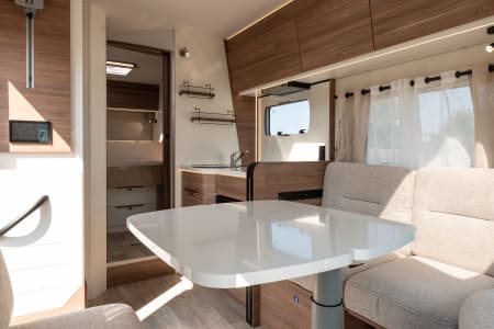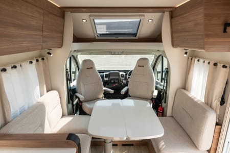 Grand salon accueillant une capacité d’accueil de 5 personnes. La pièce à vivre est lumineuse grâce au skydôme et toit panoramique. La table repliable et coulissante facilite la circulation. Le grand lit de pavillon (135x200) offre 2 couchages supplémentaires.