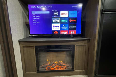 Enjoy movie nights with the entertainment center, which features a heat-producing fireplace perfectly centered in front of the loveseat.