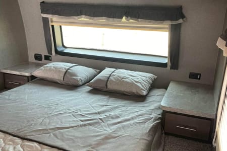 This Forest River Rockwood Ultra Lite travel trailer might just fit your dreams and needs perfectly. Sleeps 4 comfortable up 5 . You will enjoy having your own space in the front master suite with a queen comfy bed that has nightstands on either side, a wardrobe slide, and a private entrance into the dual-entry bath. The camper will have everything you need, comfortable theater seating with a fireplace view, sound bar, AM/FM radio, TV, perfect lighting for reading, lots of storage, comfy mattress, sleeping space on the hide-a-bed sofa, dinette sitting with four chairs and table extension for extra space. Outdoor and indoor Kitchen with the full amenities including a countertop extension. Outdoor lighting with two awing's, outdoor shower, storage,