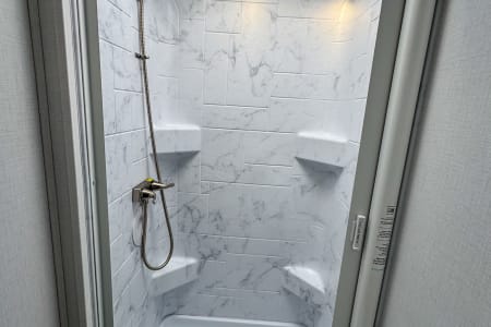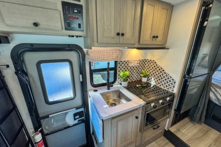 The full service kitchen has a 3 burner gas range, a convection microwave, and 10.7 CUFT 12V refrigerator/freezer. There is also a flip up countertop for extra prep space!