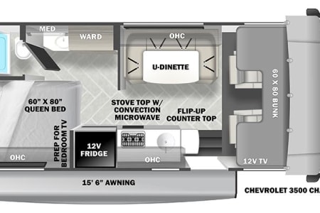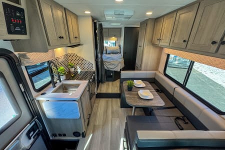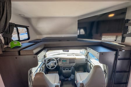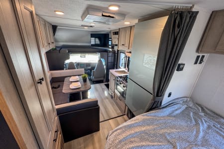 This unit will comfortably sleep 5-6 People. There is a Queen Bed in the rear of the coach with a divider curtain that can be closed off from the remainder of the coach. There is also a wardrobe and closet that offers additional storage. In the front portion for sleeping, there is an over-the-cab bunk, as well as a convertible dinette. A 12V LED Flat HDTV hangs above the living space.