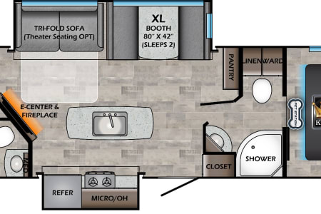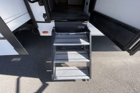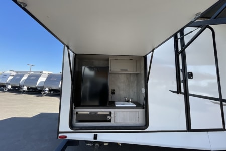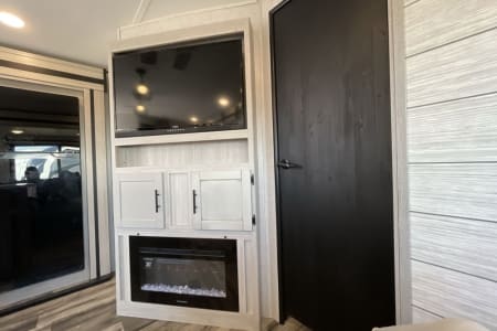 Rest your head in the front private bedroom with upgraded Queen size bed with full bathroom. Whether your camping with family or friends there is plenty of beds. The Dinette that turns into a full bed. A bunk room with a fold down couch, and 3 other twin bunks. Bunk room has a door and the best part, it has a half bath in the bunk room with a door that leads outside. Watch TV by the fireplace in two recliners. Lots of counter space with kitchen island with a large farm sink. Outside you will find a outdoor kitchen with sink, small propane grill and drink/beer fridge. There's also a outdoor shower on the rear of the RV.