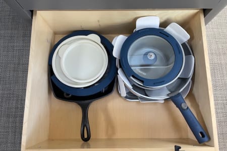 The beds and benches feature storage underneath and storage overhead. All overhead storage compartments are lit for your convenience. The kitchen has multiple drawers and cupboards available to store food and snacks. We'll get the fridge cooled down for your pickup.
