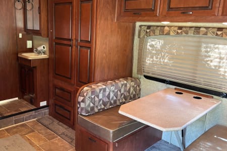 Our Getaway Coach is the perfect getaway on wheels for a couple or a family of 4. It’s a fully furnished luxury motorhome that’s ready to go when you are! Our motorhome is comfortable and easy to drive. Plenty of storage inside and out for all your camping essentials.