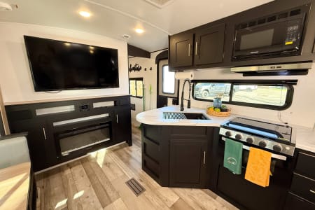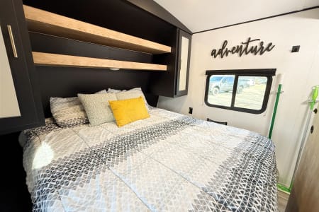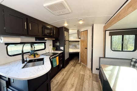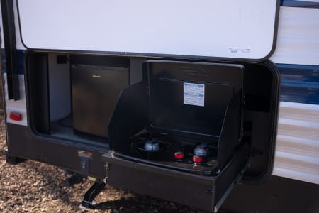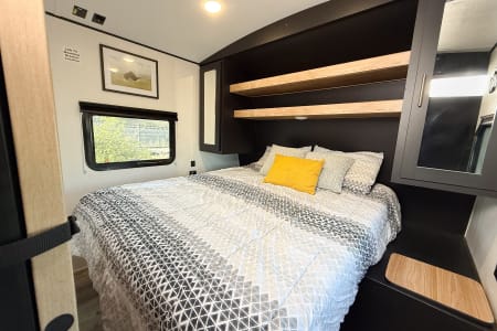 The kitchen includes upgraded appliances, a farmhouse faucet, and durable countertops, while outside, you’ll find an outdoor kitchen with a stove and mini fridge, plus an outdoor shower. This trailer also features 100W of solar, two batteries, automatic stabilizers, and two gray tanks for extra convenience.