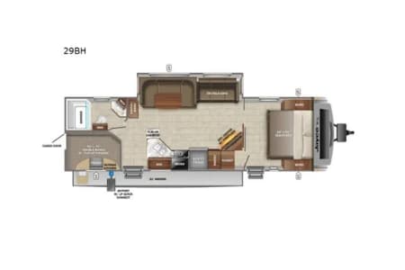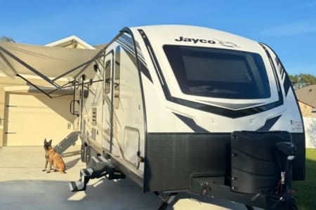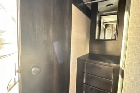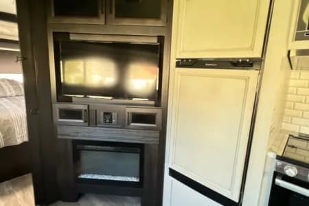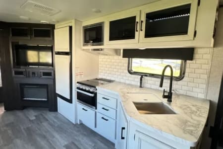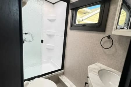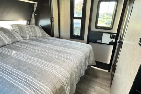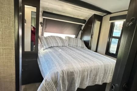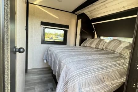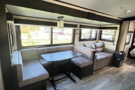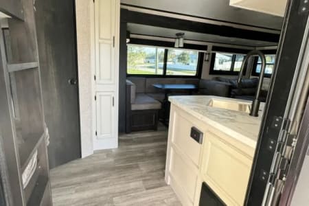 Brand new and up to date style. Master bedroom has large window at the head of the bed. Queen master bedroom in the front with Large closet for longer stays, plenty of storage for all your belongings. Double bunks that can sleep 1 or 2 per bunk. The sofa and dinette can easily be turned into extra sleeping space. Bathroom with a spacious shower. The living area has a large smart TV where you can stream movies. We provide 2 camping chairs and an outdoor rug. Large pantry and storage areas. Tinted windows to block out the heat while enjoying the views from the large windows. It is filled with features to enjoy from exterior Bluetooth speakers, power awning with LED lights, Outdoor kitchen with mini fridge and a Blackstone grille, and an outdoor shower.