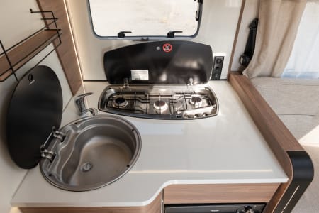 Grand salon accueillant une capacité d’accueil de 5 personnes. La pièce à vivre est lumineuse grâce au skydôme et toit panoramique. La table repliable et coulissante facilite la circulation. Le grand lit de pavillon (135x200) offre 2 couchages supplémentaires.