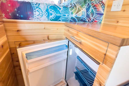 Dot will come set up with everything you need. She has an outdoor Blackstone griddle/grill along with necessary cooking gear. The fridge will keep are your goodies cold, and the ample pantry storage will ensure you have plenty of snacks. You can get cozy around the fire with the camp chairs (2) and extra blankets, for those chillier nights. We include lighters to make getting that fire going a little easier, too! You'll be ready to roast marshmallows in no time! (Roasting sticks included.)n We also include headlamps (2) and handlights, along with charging cables (Apple), power banks and a plug converter.