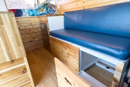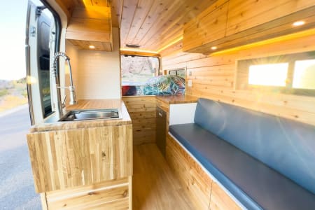 Inside the van, you've got a full length couch that can double as a bed, if desired. There is also a modular table that can swivel from the couch, to the passenger's captain chair, to make indoor dining (or working) easy and comfortable. There is plenty storage space inside, to stash all your gear and keep your stay comfortable. You can start your mornings with coffee and relaxing, after a great night's sleep on the memory foam bed--two adults sleep comfortably. We're 5'8" and 6'2" and we fit, with our pup!