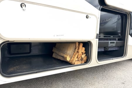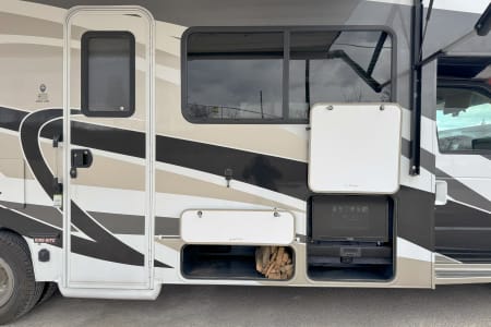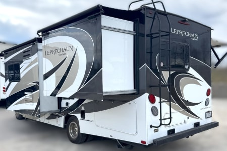 Entertainment is covered with a flat-screen TV, DVD player, and an outdoor entertainment center. The motorhome also includes dual slide-outs that expand the living space, an electric awning with LED lighting for outdoor relaxation, and an onboard generator for off-grid adventures. With exterior storage compartments and an outdoor shower, the Leprechaun is designed to accommodate all your travel needs.