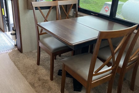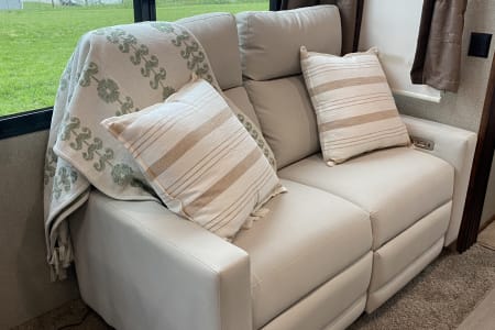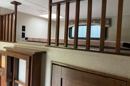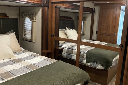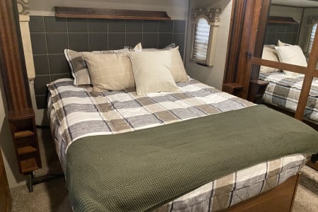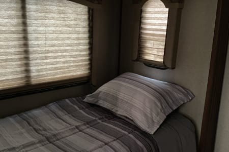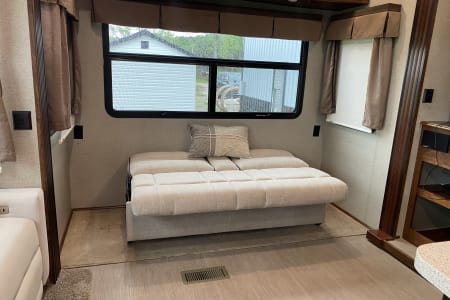 This camper features a master bedroom with a queen size bed, as well as a separate bunkhouse, and a sofa that converts to a bed for plenty of sleeping space for adults and kids alike!