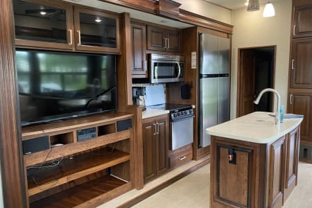 The kitchen is fully equipped with a refrigerator, stove, oven, microwave, and kitchen island with built in sink for you to prepare delicious meals just like you would in the comfort of your own home!