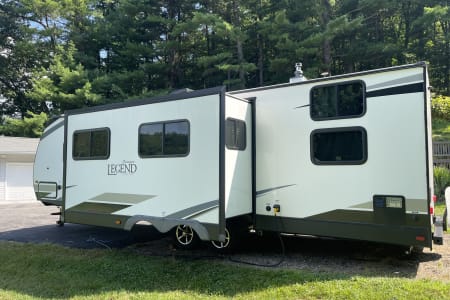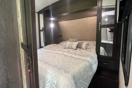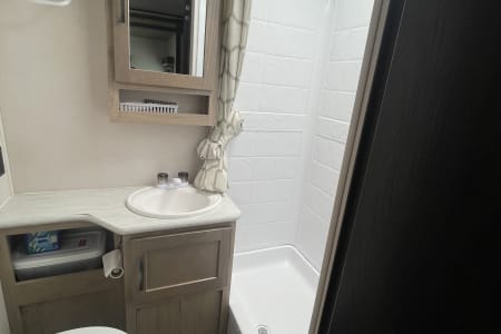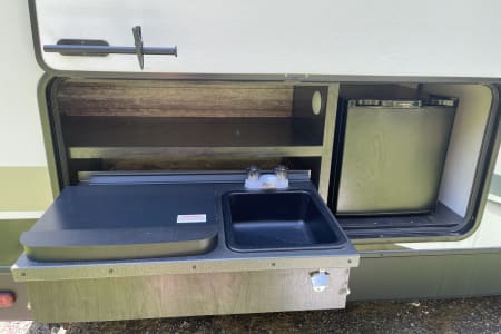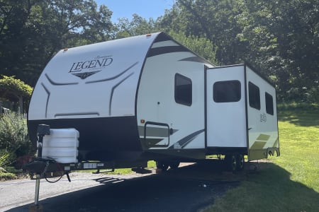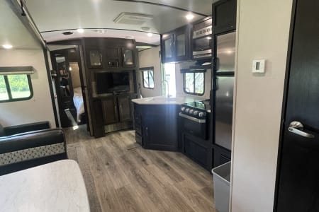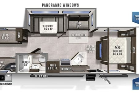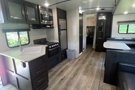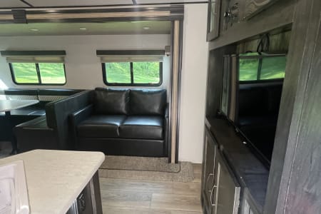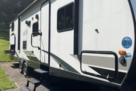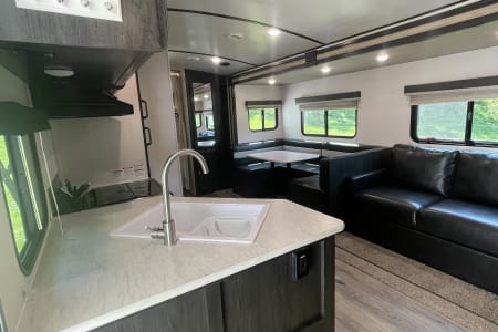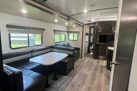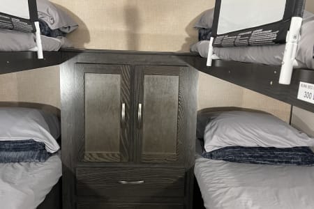 This clean 6-8-sleeper trailer camper is ready to host your crew! The double set of bunk beds, table conversion full size bed and optional fold-down sofa offer a comfortable space for your family, along with a private sleeping space with a queen bed. You can prepare your meals using both the indoor kitchen and outdoor prep space with a sink and refrigerator. The sofa and U-shaped dinette offers additional indoor seating for meals and games. This camper comes fully equipped with kitchen items to prepare and enjoy your meals, bed linens, 2 recliner camping chairs, and XL outdoor rug. Also, inquire about our Blackstone grill!