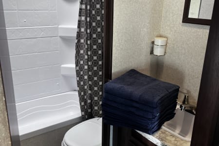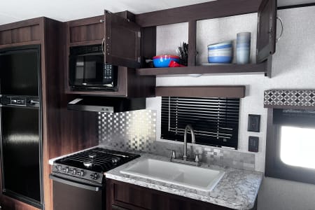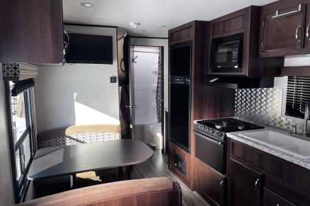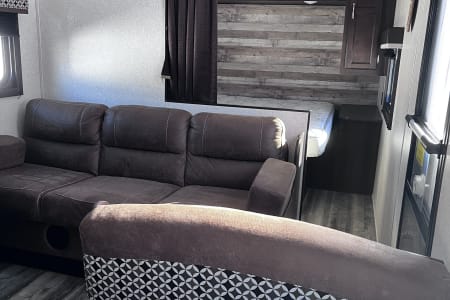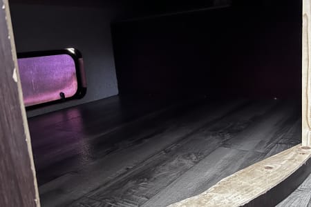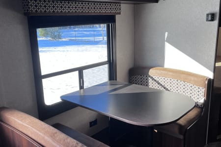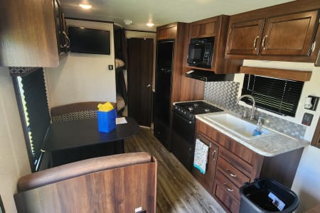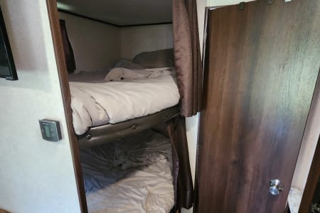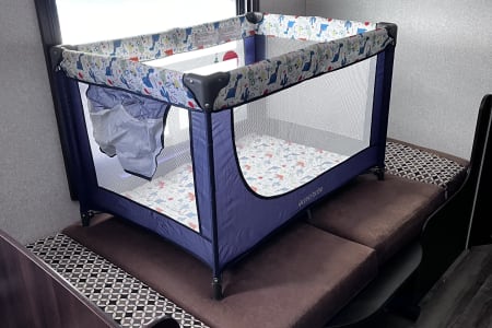 "Mya's Way" is a dog and kid friendly space to bring along the adventure with you, as we know, our kids and dogs are family too! This charming camper has a queen bed with privacy curtains and storage up front, living space in the middle and the bunk beds at the opposite end close to the bathroom. Under the bunkbeds is a "nook" for your furry family member to join in the fun. The dinette and sofa turn into beds as well for kids-smaller adults. Pack and play can also fit on the laid out dinette safely and sturdily with enough room for changing space and your baby's essentials close by. This camper has a full shower with tub inside for those after swimming baths, and an outdoor shower for rinsing off the mud play. We ensure that "Mya's Way" will provide you with a comfort of home as you enjoy the outdoors.