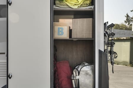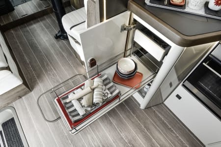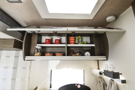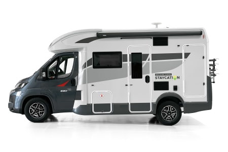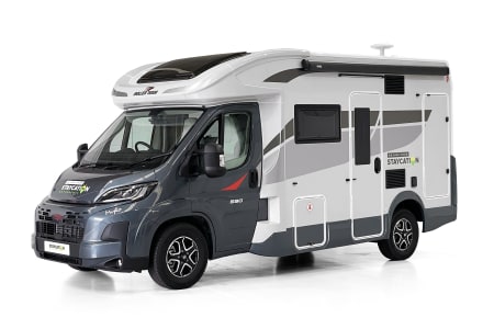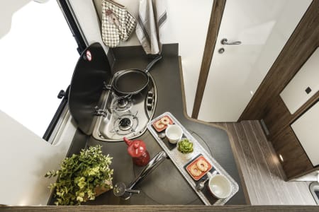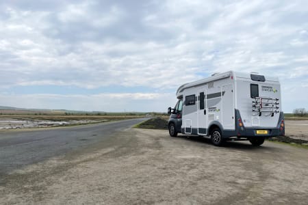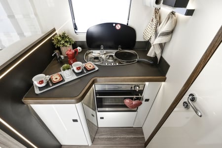 Mylo our T-Line 590 from Roller Team. Mylo offers a tardis like interior with a spacious seating area, well appointed kitchen with a great sized floor to ceiling fridge/freezer and large rear washroom with separate shower. This model is great for couples and small families and features the option for 2 large double beds.