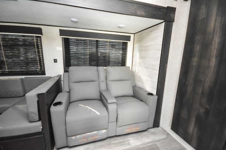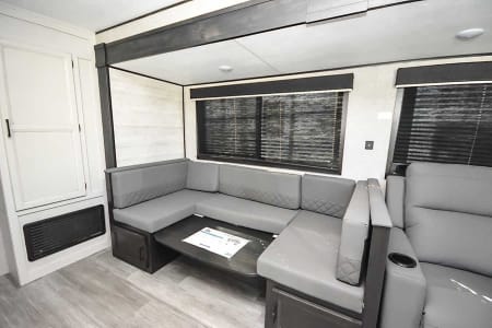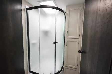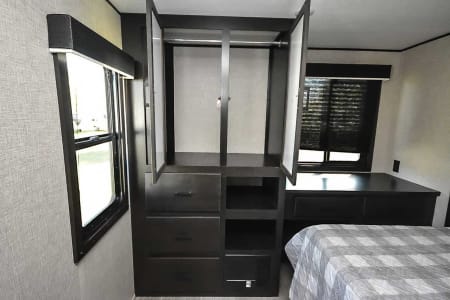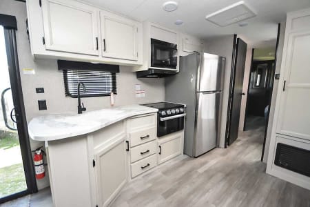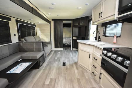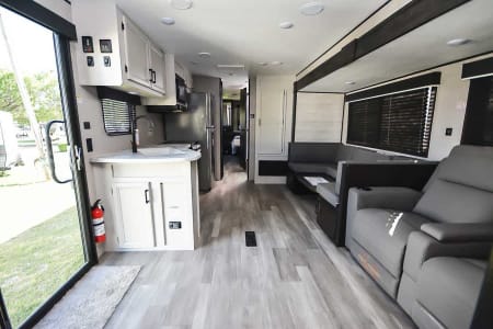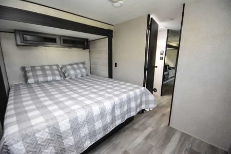 40 foot with rear King bedroom with its own door to the outside, with Queen bedroom in the front Full size fridge with toaster oven pots and pans, six plates, six bowls, six cups, has blender, food chopper, basic utensils, and measuring cups and bowls