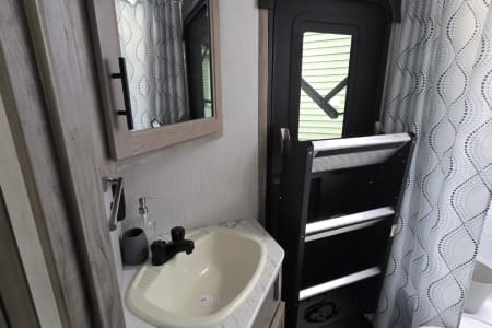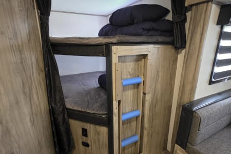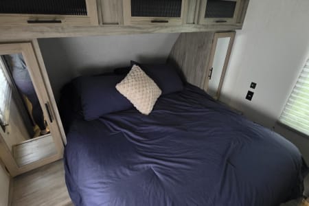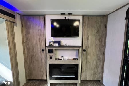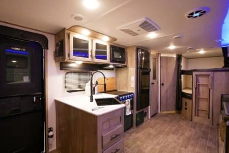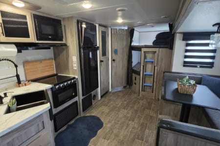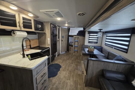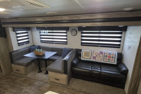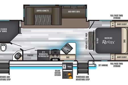 Enjoy a relaxing vacation in the Alpha. This camper sleeps 10 and has plenty of floor space for family fun. Relax in front of the fireplace, watch a movie with popcorn, and play games at the wrap around dinette on cool or rainy nights. On sunny days, use the camp chairs to relax under the awning or around the campfire. For those who love outdoor cooking, the Alpha boasts an outdoor kitchen, grilling essentials, and a full set of cookware and dishes. Families will enjoy the private master bedroom, double entry doors that cut down on foot traffic, and full list of amenities to make vacation relaxing and stress-free.