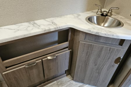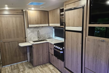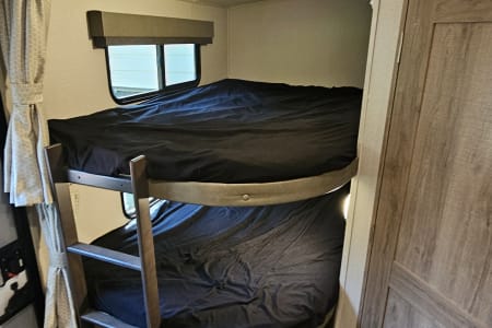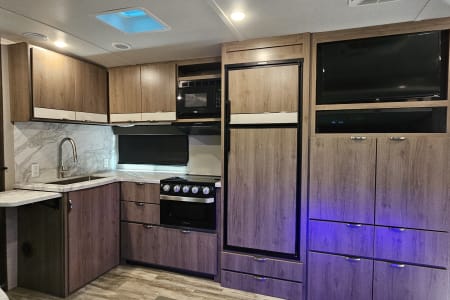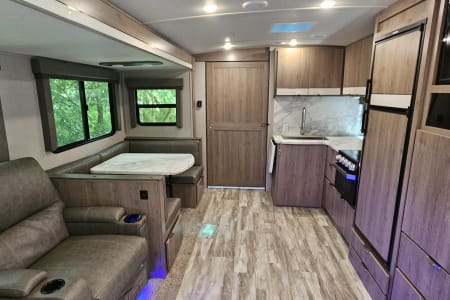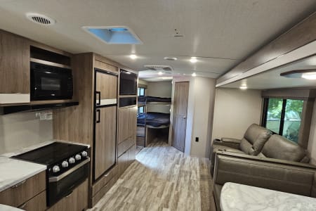 Welcome to our home away from home. This beautifully sleek and modern 2021 Imagine by Grand Design has everything you need to make your adventure unforgettable while you enjoy the great outdoors in style. Whether you're camping lakeside, tailgating, or heading to the mountains, you can do it in comfort. It's perfect for families, couples, or friends looking to enjoy a memorable camping getaway. It features a queen master bed, double-size rear bunk beds, and convertible dinette. The slide-out provides a spacious living area where you can sit back and relax with the added luxury of dual heated and vibrating recliners, as well as entertainment center including TV, Bluetooth, and indoor/outdoor speakers. The kitchen features a fridge/freezer, 3-burner stove, microwave and oven, and is complete with coffee pot, cookware, dishes and utensils. The electric awning features LED lighting for shade and ambience. You also have the added bonus of an outdoor kitchenette with small fridge and 2-burner stove. The heating and air conditioning allows for all-season comfort. Enjoy campfire nights, roasting marshmallows, hot meals under the stars, and movie nights in the recliners. This is how RVing was meant to be.