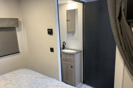 Bathroom door can open to fully close off the back of the unit including bedroom, shower and toilet area for extra private space while bathing.