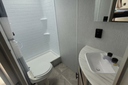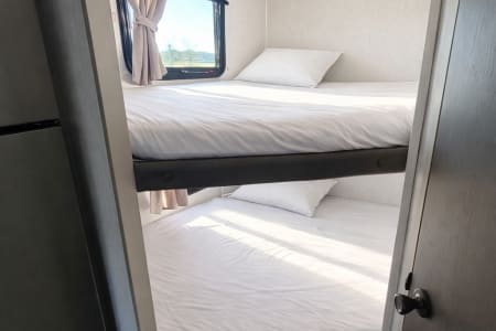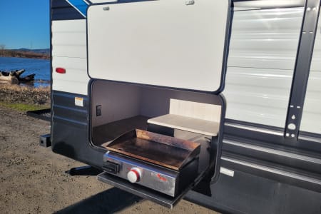 There are plenty of comfortable sleeping spaces between the rear corner double bunk beds and the queen bed inside the front private bedroom. The bedroom also has wardrobes and nightstands on either side of the bed too. When you're not using the U-shaped dinette slide to enjoy a meal or play a game, you can transform it into an extra sleeping space. The rear corner bathroom has a 40" tub/shower for you to rinse all the sand out of your hair from your beach day. On a warm sunny morning you can enjoy making breakfast outdoors on the outdoor kitchen cook top!