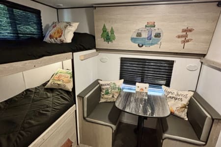 This RV can sleep up to 8 and there is a bunkhouse in the back with 3 bunks. Enjoy sitting under the awning with led lighting and outdoor speakers. There is an outdoor grill and mini fridge for entertaining outside. There is an outdoor shower to rinse off with. All hoses and hookups included. There is a tv in the living area and one in the bedroom.