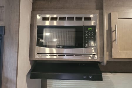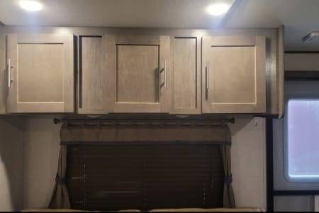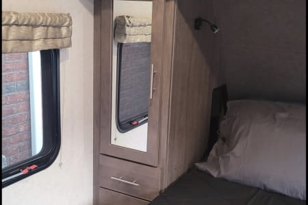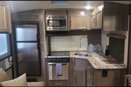 New queen/full bed linens, plenty of space to cook with our new cookware pots, pan's ext. New appliances like gas/electric refrigerator, microwave and gas stove (3 burners) Brand new queen size bed with over the head storage. Closets to hang all your belongings. Outside full length awning with lights and speaker for music in and outside. Two Propain gas tanks for heat and stove, electric fireplace. The camper is also kid and pet friendly.