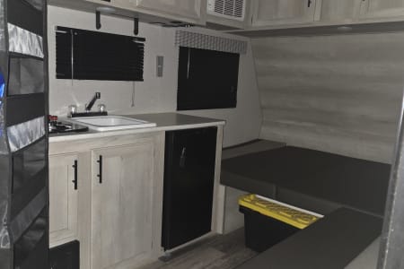 Set up camp in breathtaking locations while enjoying the warmth of your own space. The trailer features a snug sleeping area, and a well-equipped kitchenette to prepare meals on your journey.