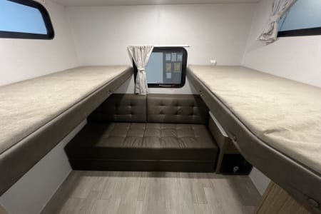 This is a full-sized family travel trailer with loads of upgrades and amenities. The private bedroom features a King island bed with nightstands. The living and dining area slides out to offer extra roominess and comfort with a full size kitchen which includes an oversized 11 CU. FT. refrigerator, stovetop, oven, and pantry. U-dinette, Versa-Lounge, and walk-in shower in full bathroom. The dinette and sofa bed both convert into beds for extra sleeping space. The rear of the trailer features 2 bunk beds and Couch that lays out flat to a Queen size bed.