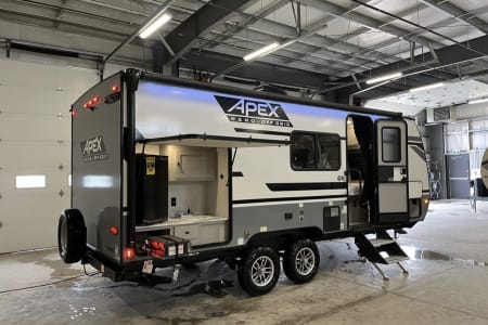 Hey there! Let me introduce you to APEX, a new RV that can comfortably accommodate 4 people. Get ready for your next adventure in this amazing, fully-equipped trailer. APEX provides a convenient electric 16' awning that can be effortlessly operated with a button push. Plus, it's equipped with stabilizing jacks at all four points for added stability.