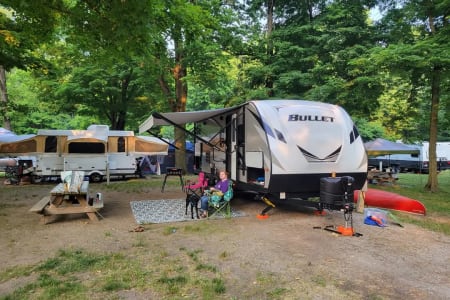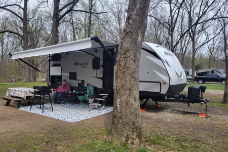 Our 28ft travel trailer turns regular camping into Glamping. For a 3 day weekend getaway or even a week vacation. Our camper has everything you could think of and maybe more! For comfort this camper can sleep comfortably up to 8 guest; has the convenience of a indoor or outdoor shower; a industrial flushable toilet; and all the cooking utensils you could need. For travel this camper comes with an adjustable hitch and sway bars for extra support and durability. Set up is just as easy with electric power Jack's, leveling blocks and chokes to make set up painless. This camper is the perfect camper to have a relaxing getaway and also make memories with your friends and family. Book today and message for all and any questions for your next vacation!
