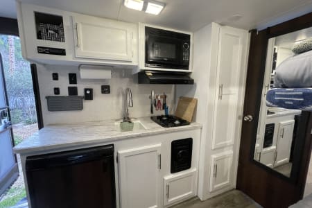 Fully Equipped Kitchen – Includes a 2-burner stove, microwave, refrigerator, and sink—perfect for cooking meals on the go.