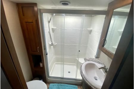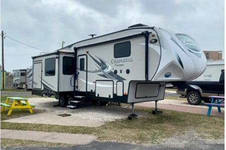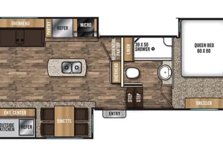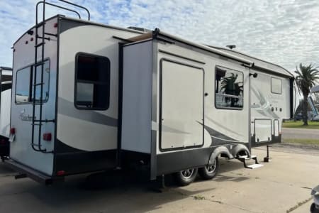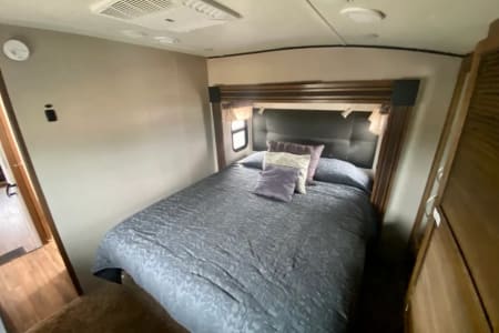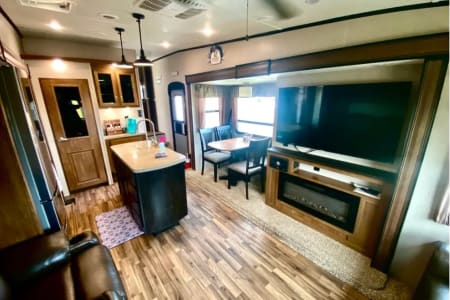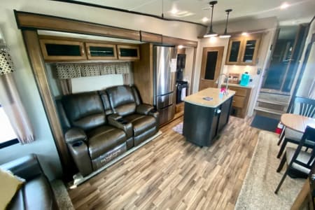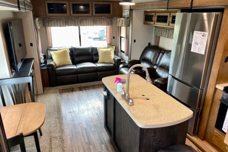 This 34ft 5th wheel is made for the traveling duo. This RV rental gives the perfect amount of space to entertain a few friends and then cuddle up at the end of the day! There is no shortage of space and style in this fantastic RV. The perfect size to fit in most RV sites, last minutes spots, and plenty of expanding floor space with 3 slide outs.