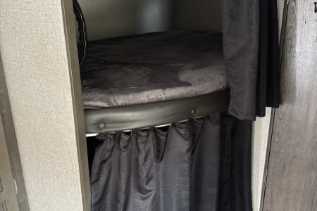 • Room for Everyone: Full-size bunk beds for the kids (or extra friends!), a convertible dining room table, and fold out couch, plus a private bedroom with a comfortable queen sized mattress for the grown-ups to stretch out and relax. Sleeps 8 comfortably. Equipped with A/C and heat.