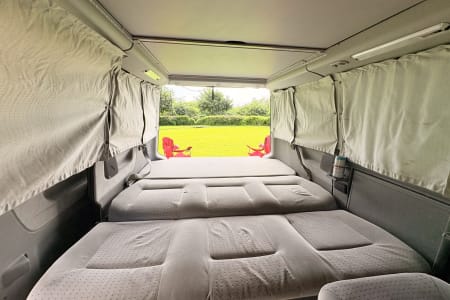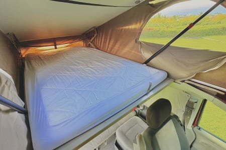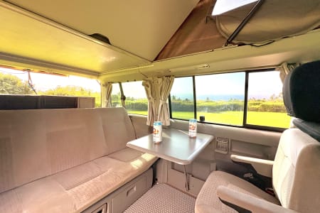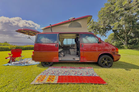 Experience the ultimate Maui adventure in this VW EuroVan, the perfect home on wheels for your island getaway. This well-maintained camper van features a pop-top sleeping area for two and a pull-out bed below for two more, comfortably accommodating up to four people.