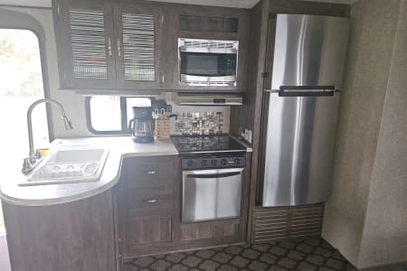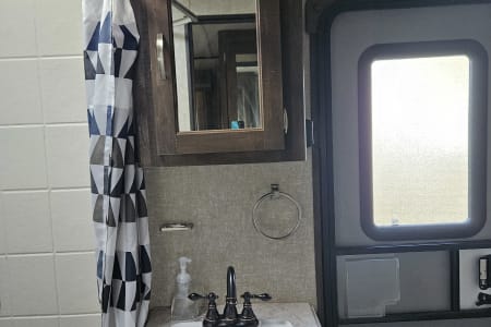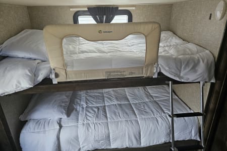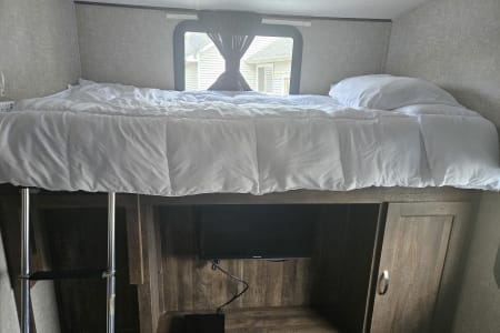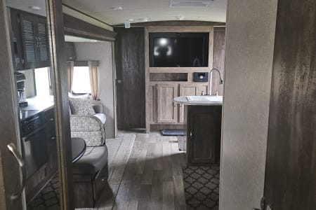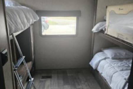 Very spacious travel trailer with room for the whole family and a friend or two. There is a bunk room in the back with 3 single beds and a master bedroom with a queen bed in the front. You will love the residential grade refrigerator, no more frozen foods in the back of the fridge. The exterior door to the full bathroom is great for easy access.