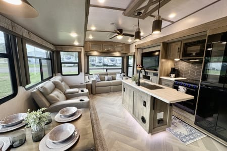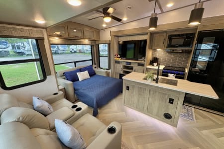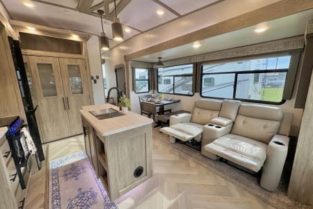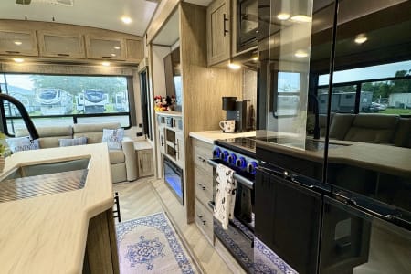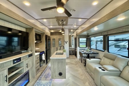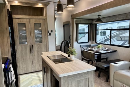 Counter Space: Includes a kitchen island with a large sink and a roll-up sink cover.