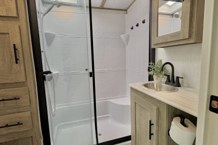 Sink: Features a bathroom sink with a medicine cabinet above.