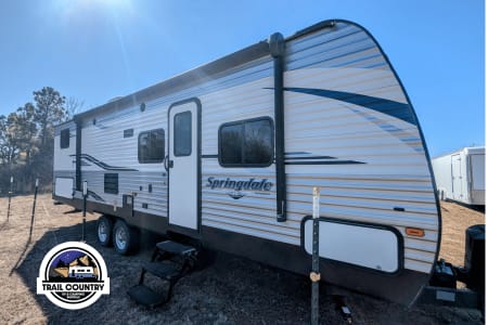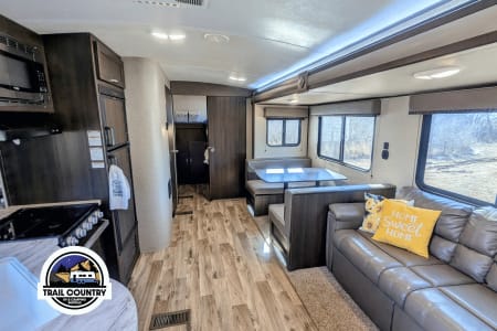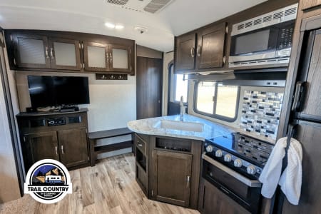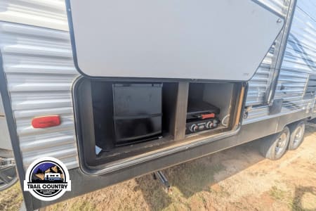 This 32' camper boasts dual AC units, a kitchen stocked with essentials, and an outdoor kitchen, plus bedding and linens, are provided to make your stay a breeze!