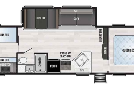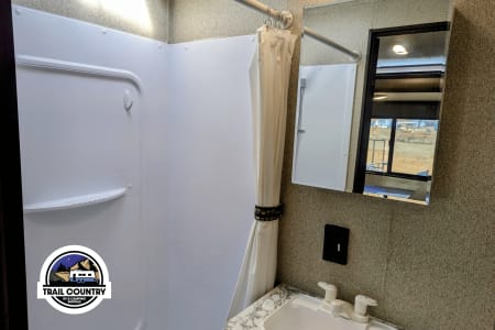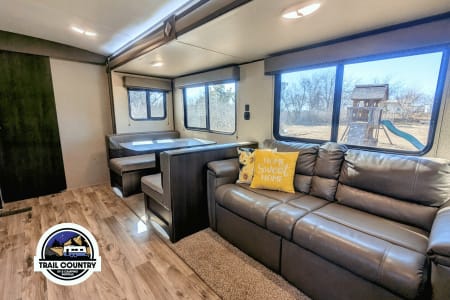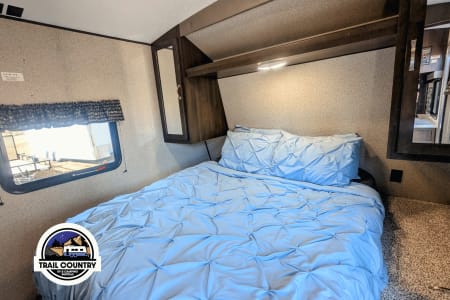Looking to camp with privacy and plenty of space? Look no further! Inside you'll find an extra large living room slide, and two bedrooms with enough sleeping space for 9.