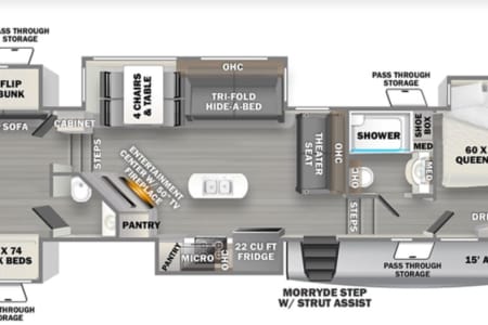This Sandpiper Luxury fifth wheel has everything you will need for a comfortable camping trip! Your kiddos or guests will have their own privacy with the rear private bunkhouse that has a flip bunk above a glide sofa slide, a set of 32" x 74" bunk beds, an entertainment center with wardrobes on either side, and even a half bathroom. There are two pantries to store everyone's snacks, a residential refrigerator to keep your perishables fresh, a four burner cooktop to fry up some eggs, and a kitchen island with a double sink for easy clean up. The tri-fold hide-a-bed sofa and theater seating offer comfortable places to sit while you enjoy the fireplace and 50" flat screen LED HDTV at the entertainment center. The front private bedroom has a queen bed slide for you to lay your head at night, a shoe box to keep your shoes out of the way, a dresser, and a front wardrobe to hang your clothes!