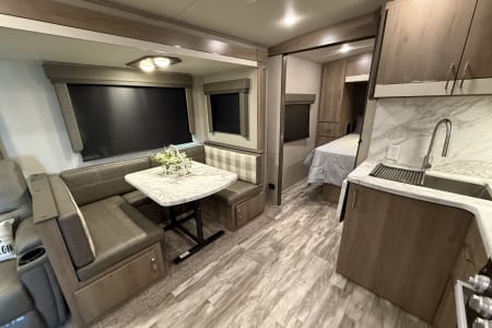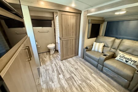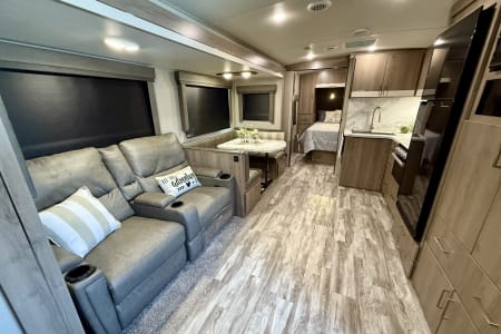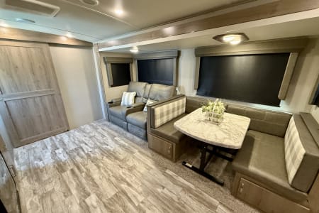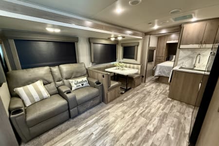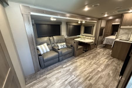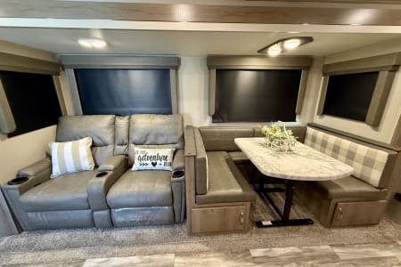 -Comfortable living area with theater seating or a tri-fold sleeper sofa and a dinette