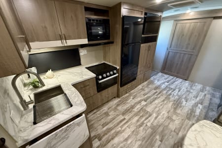 -Fully equipped kitchen with a 3-burner stove, oven, microwave, and large refrigerator