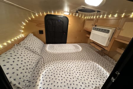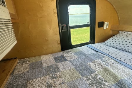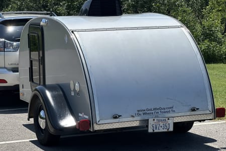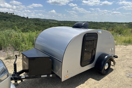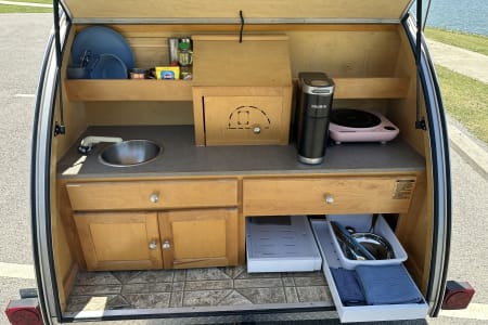 Enjoy a relaxing getaway in this cozy Little Guy tear drop camper! It’s light enough to be towed by any vehicle with a hitch, and big enough to sleep two people safely and comfortably. Open the windows, let the sunlight in, and feel the breeze while keeping the bugs out. Read a book and enjoy your morning coffee or evening tea while keeping cool from the hot weather. The rear of the camper has a small kitchen with a sink and cooktops. It’s a perfect camper for those who like cozy spaces and less technology, leaving time to truly enjoy the natural environments around you. The camper is kept clean and stocked with the essentials to have an enjoyable camping experience.